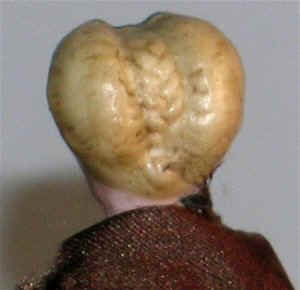 The doll below has a low-cut original dress of netting and ribbon with cotton and lace pantaloons and petticoat. Only 3¾" high, her diminutive face was likely difficult to paint; at any rate, it is a simplistic rendition. Her proportions suggest a young woman meaning that the scale is a reduced one; in general, children and babies become more prevalent about 1900.