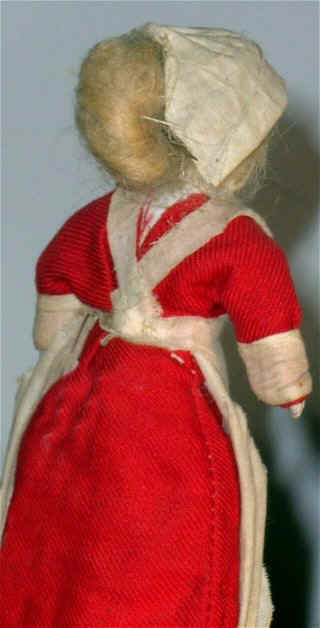 Another maid* (5" high) who came with the moulded-hair family described above; in general, wigs appear in the 1860s as they looked more natural than moulded hair; untinted bisque with white skin and painted features; cloth stuffed body; tiny feet; machine stitching on the dress with hand-embroidered detailing on the flannel petticoat