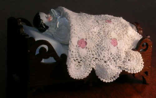 detail of dressed china doll with real hair in bed/sitting room, 14½" x 10"