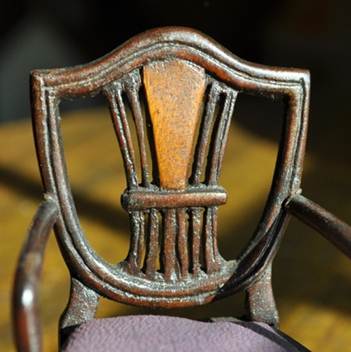 Style is tempting to use for dating but can be problematic, for example, Rococo Revival was used in early pieces but continued into the early 20th century. In the 1920s, an enthusiasm for colonial items in the United States (for example, Tynietoy) saw a revival of old fashioned forms. In the 1960s (and continuing today), adult collectors wanted period styles such as Chippendale and Hepplewhite. The technology had changed to mass production, however, and, hopefully, most modern pieces were labelled with the company (for example, Shackman) and country of origin (or example, China). It is tempting to see a smooth progression from a plain appearance in furniture to an elaborate one as the decades rolled by during the 19th century but the reality was no doubt more complex and contradictory than that. There is logic in thinking about miniatures as being in tandem with or lingering later than the styles evident in real furniture. It is not likely that a child's play toy was in advance of what had become popular in the adult world. It is worthwhile, therefore, considering style as a general guide for dating (but complicated by differences in taste among countries). The dating -- for the most part -- of the selected examples shown below is an educated guess. note defects in casting, moulding and finishes are more apparent and distracting in close photographs than when the miniatures are displayed in an appropriate setting EXAMPLES OF REVIVED STYLES FROM THE MODERN ERA BASED ON STYLES FROM THE LATE 18TH & EARLY 19TH CENTURIES: