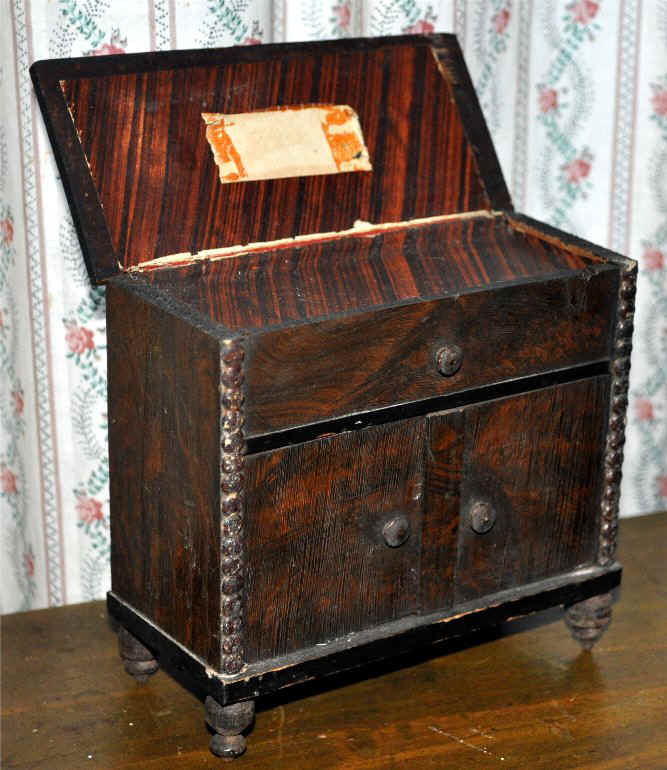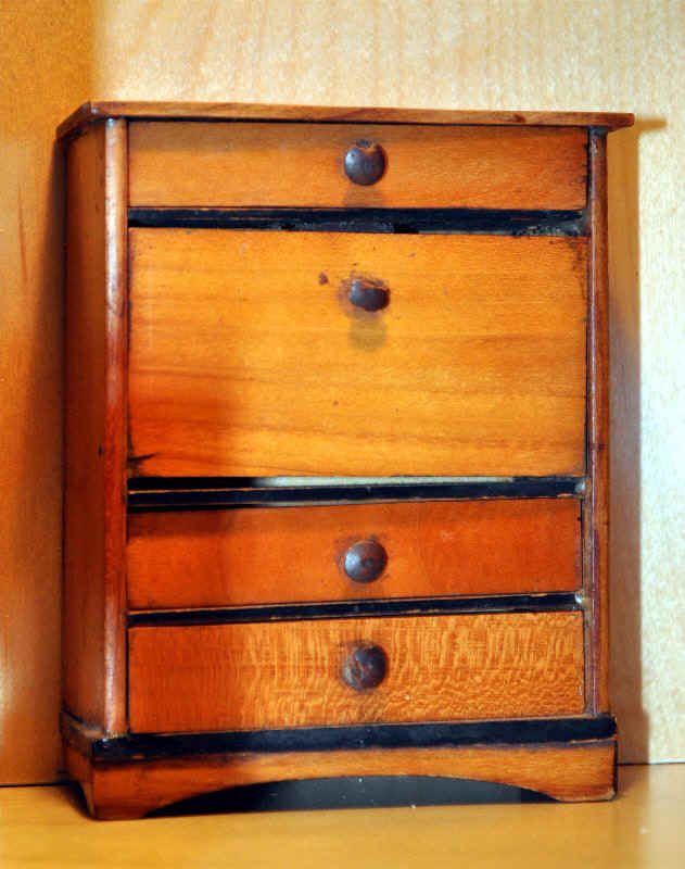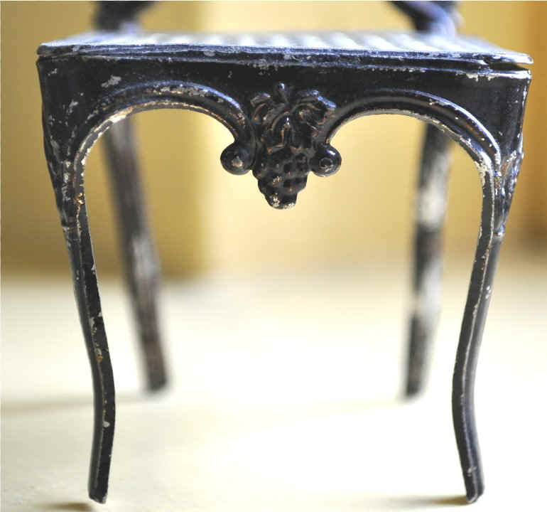 The tin sink above is easy to date because it is labelled but this armchair is one of the many dollhouse items forcing the collector to guess at its history -- is it a late reproduction or an early Sheraton-styled miniature? The painted ornament and cloth seat seem to have enough ageing to suggest an early origin. It is unnerving, however, that a label looks to have been deliberately removed from the wood seat bottom. 4 inches high