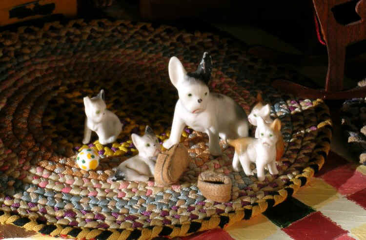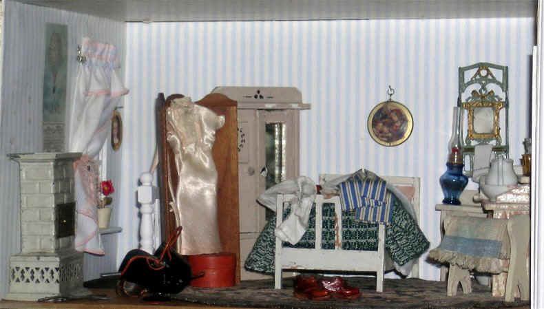 animals, and misc. toy buildings by Jennifer McKendry These historic and contemporary images© complement the History of Dollhouses article with more emphasis here on the visual and with minimal text. Currently posted are images dealing with a couple of decades before and after 1900. Click here for an INDEX to the sections if you are interested in a specific brand or maker or a general type of furnishings but please feel free to amble through the 8 sections at your own pace and enjoy this "antique world in miniature". section 1 (below) is a cupboard dollhouse section 2 has a variety of antique dollhouses section 3 contains farm buildings & animals, schools, shops and misc. buildings section 4 contains cooking & eating: kitchens & dining rooms section 5 contains parlours section 6 contains washing, dressing & sleeping: bedrooms, the nursery section 7 contains everything else! such as sewing, items for the desk, vases & urns, statuary, cages..... section_8 contains items on the porch and in the yard, such as pets, horses, automobiles, fences, people in outdoors clothing, furniture.... (note The digital size of these images is larger than in the history of dollhouses article for greater clarity in the details and this may cause longer downloads for dial-up users. The Gallery is divided into independant sections to make downloading easier. At the end of each section, please click where indicated to continue viewing the rest of the Gallery.) SECTION 1: A CUPBOARD DOLLHOUSE WITH FURNISHINGS c1870 - c1920