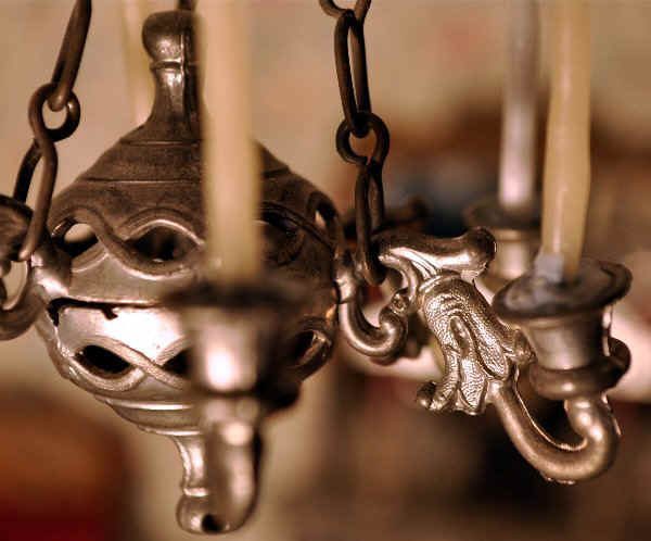Metal 6-arm chandelier marked Germany; one of a pair; note the relatively small cups for candles (in contrast with chandeliers with wide cups to hold globes lit by gas or oil); a detail is shown further below