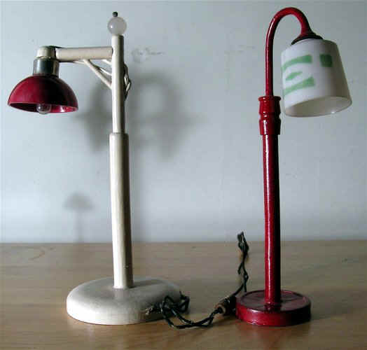 Tootsietoy made what were likely the nicest dollhouse lamps in the United States during the 1920s and '30s; the forms were limited in number but different colours and combinations of colour made them seem more varied; the colours co-ordinated with their small-scaled, painted, metal furniture; the floor lamps are 2¾ inches high, and closely resemble real lamps of the era (above left)
