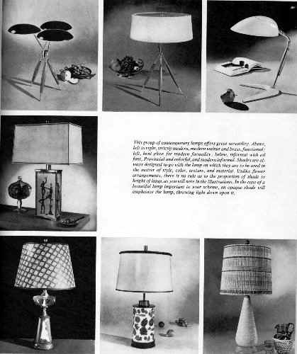 Modern design began to infiltrate middle class furnishings in the 1950s with geometric abstract shapes, new materials like chrome, and clean lines rejecting historicism; on the other hand, tradition survived in classical and revival designs as seen in the electric "oil lamp" in the bottom left corner of this illustration of real lamps from the 1954 Ladies Home Journal printed in Philadelphia