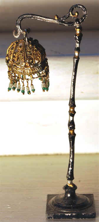 right Dollhouse wall fixture with original light bulb, metal with fringe of white and green beads, German, 1920s; with wire attached so that it would actually light, probably with a battery as the power source; 1¾ inches long below left real floor lamp, tinsel lace top, georgette panels, tinsel flower trimming with heavy braid and 5-inch fringe, metal stand, 1920s below right dollhouse floor lamp with wire metal shade and beaded fringe "married" to a metal stand, 4 inches tall
